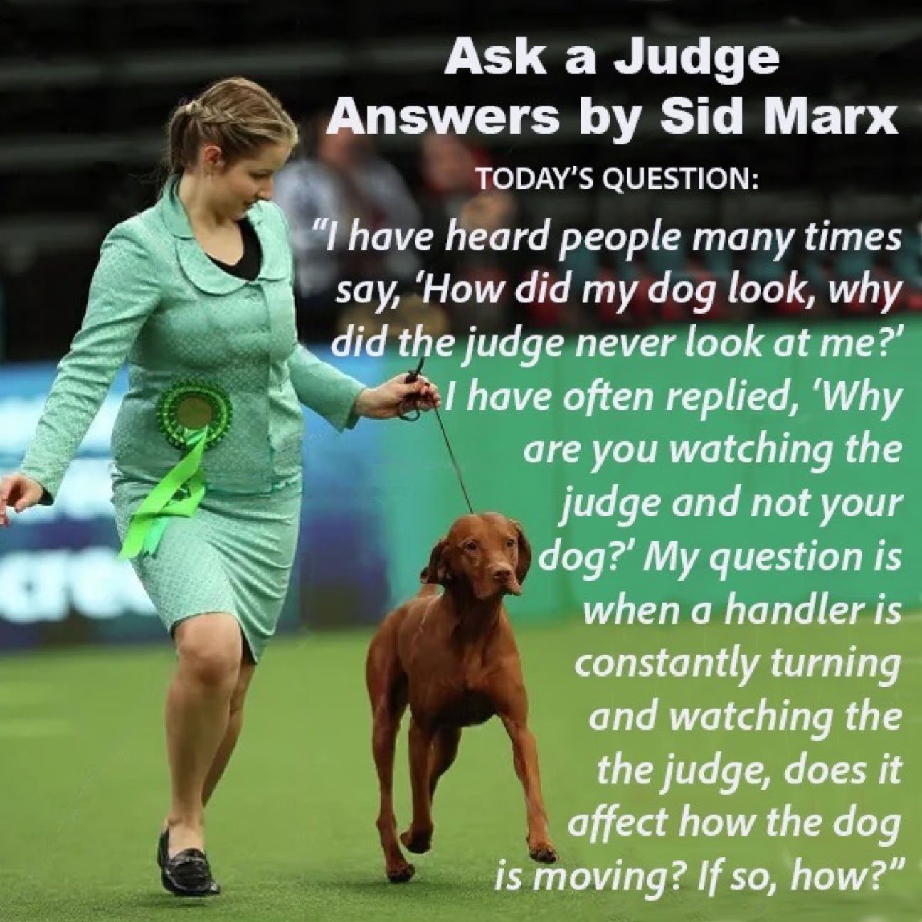 Continually looking over at the judge as you are moving your dog affects your dog in many ways – all of them bad. When a handler keeps looking up at the judge, it almost always causes the handler to move her arm from side to side, with the result being that your dog’s stride is thrown off, causing your dog to also move side to side and out of balance. When the handler continually looks up and to her left to see the judge, almost always this causes the handler’s stride to be shortened, and obviously, the dog adjusts her stride to the handler, making it look as if it has no forward reach (which would normally be seen if the dog was straight in shoulder). Not the impression you want to make on the judge..