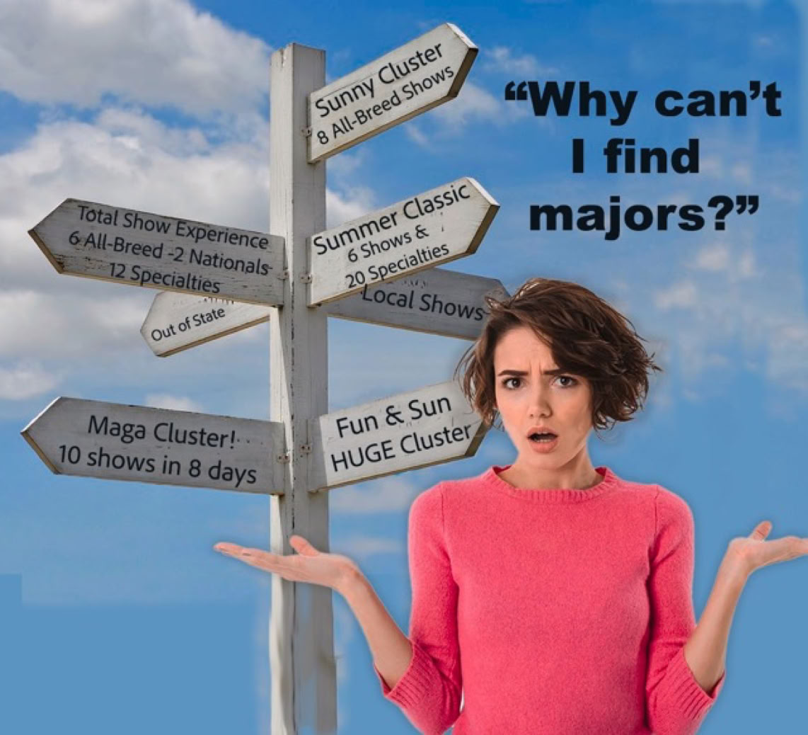 "With entries down, it now takes fewer dogs to create majors at shows; yet there are so many clusters. How has this hurt or enhanced the dog show world?”