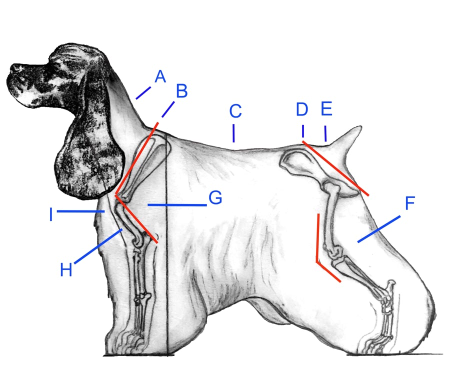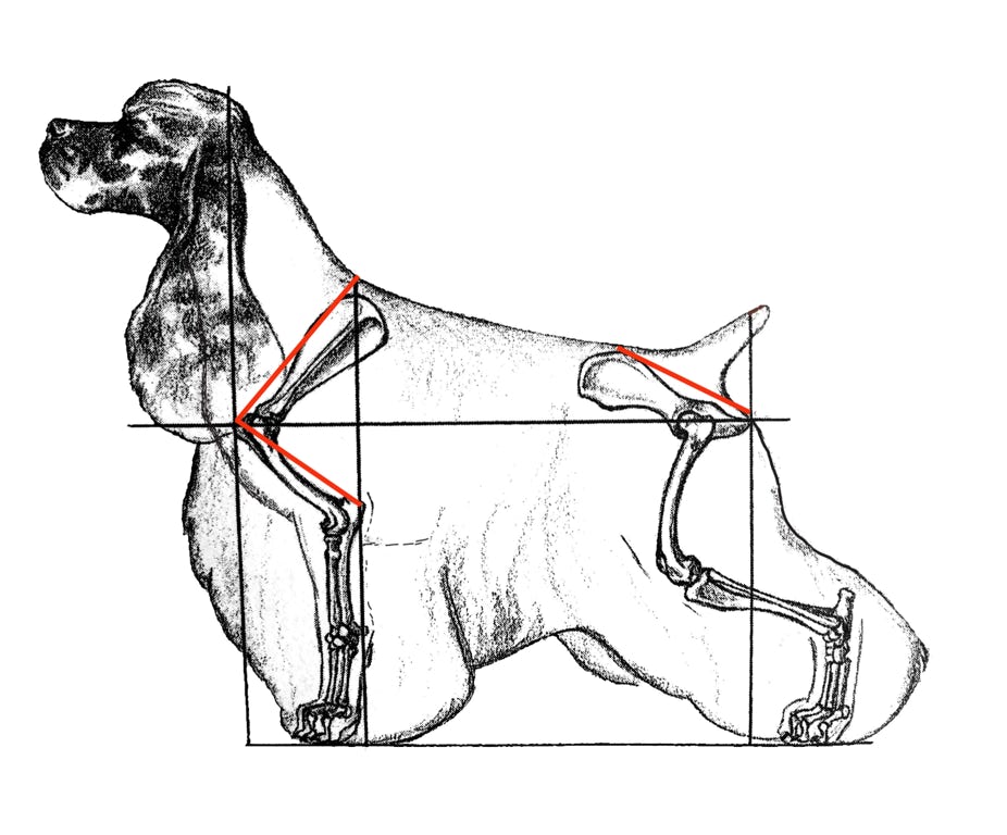 The type of movement we are talking about is more than “flash and dash,” or how fast your dog moves around the show ring. Outstanding movement is based on proper structure. How your dog is built determines his stride. Proper structure allows a dog to go the distance with less effort and gives him improved shock absorbency in athletic activities such as Agility and hunting. Good structure enables him to remain sound throughout his lifetime. While the Breed Standard gives lists of traits and attributes of the breed, we will highlight some of these with visual examples.