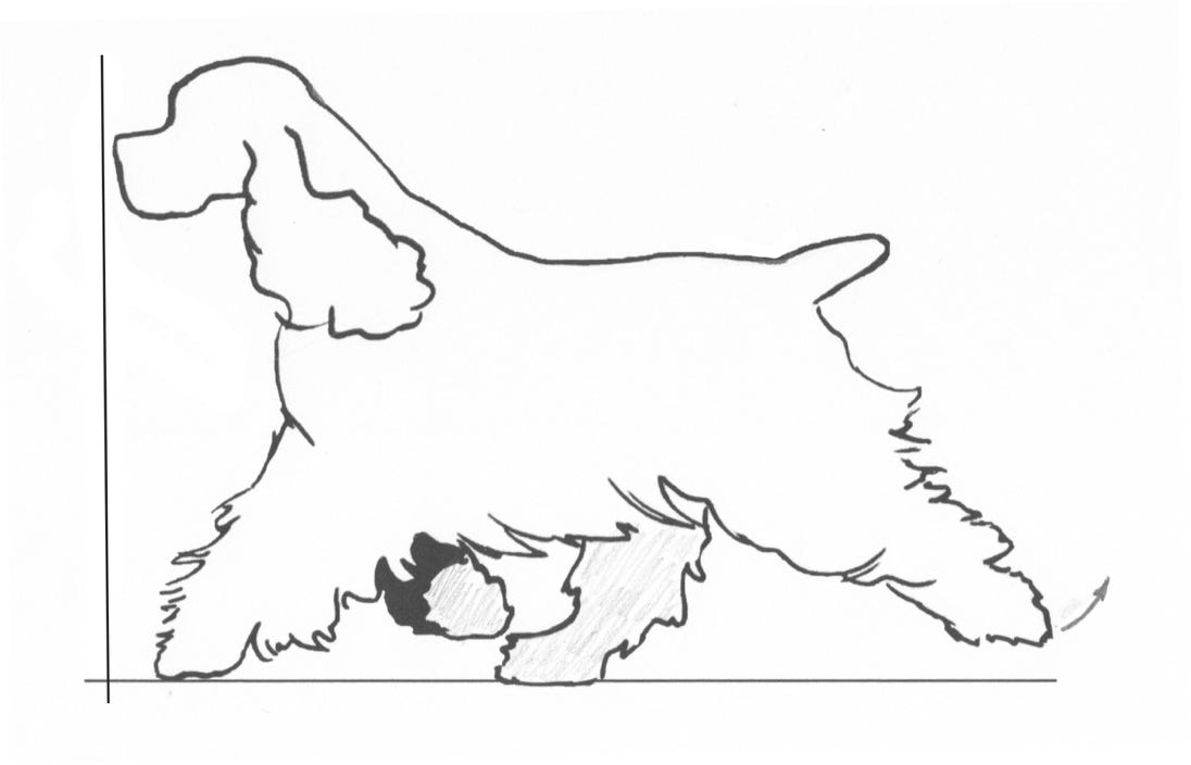 Length, depth, and spring of rib allow room for needed heart and lung capacity. They are vital in Sporting breeds that are required to work for long periods of time. A Cocker who is “short backed” is one with a long rib with a short loin.