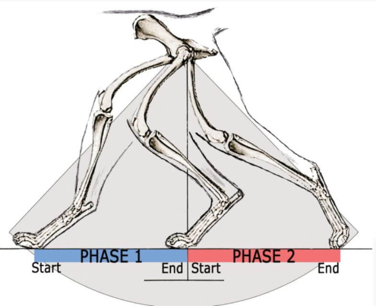 As the angles open, the toes of the rear foot first start to come into play by digging into the surface, providing traction as the rear leg fully extends its angles backwards. This sequence of rear action repeatedly goes from right rear leg to left rear leg over and over. As the right leg goes through phase one and two, the left leg lifts from rear extension after phase two and begins closing its angles in the process of moving the leg forward and re-extending just before the start of phase one. Then, they switch.