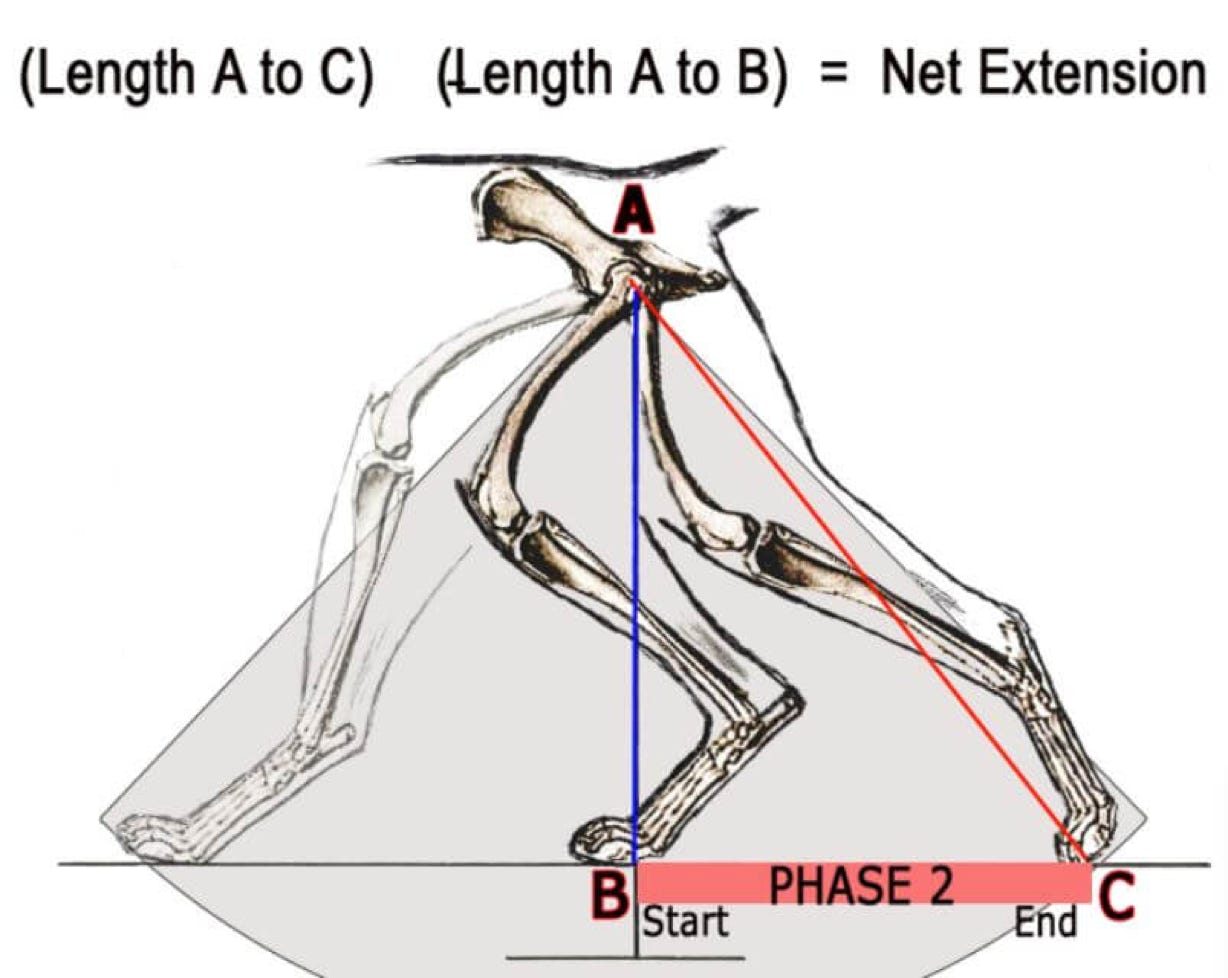 Another area of importance is the net extension applied during the back reach in phase two. The net extension is the measured difference between the distance from the hip joint to the paw at the beginning of phase two when the rear angles are closed, and the distance from the hip joint to the paw at the end of phase two when the rear angles are open. Net extension is a key component in determining the amount of rear drive a dog can generate.