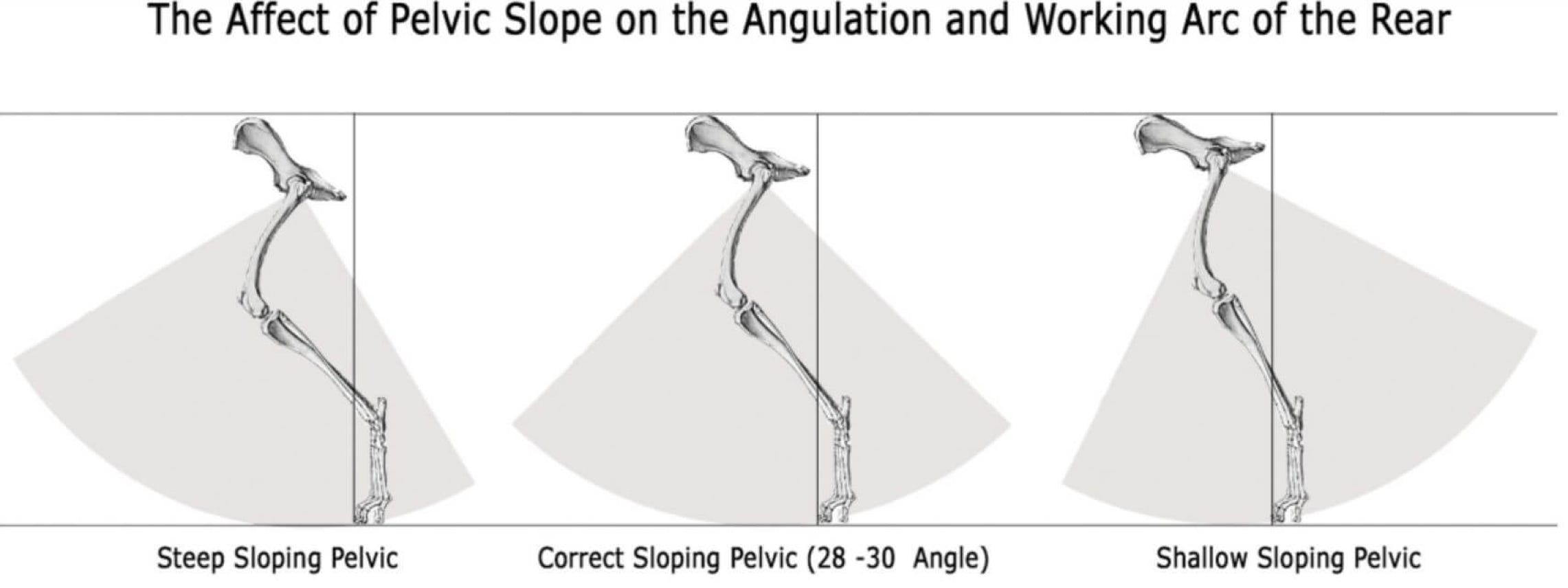 The angled slope of the pelvis helps determine the angulation you see when the dog is standing. Dogs with the same proportions and length to their bones of the rear assembly can visually display different angulation depending on the slope of their pelvis. Notice the changes in the amount of angulation associated with different pelvic slopes in the figure below. A dog with a steeply angled pelvis will display more turn in the stifle and hock than dogs having a more moderate or lesser angled pelvis. Again, this is dependent upon all bone proportions being the same.